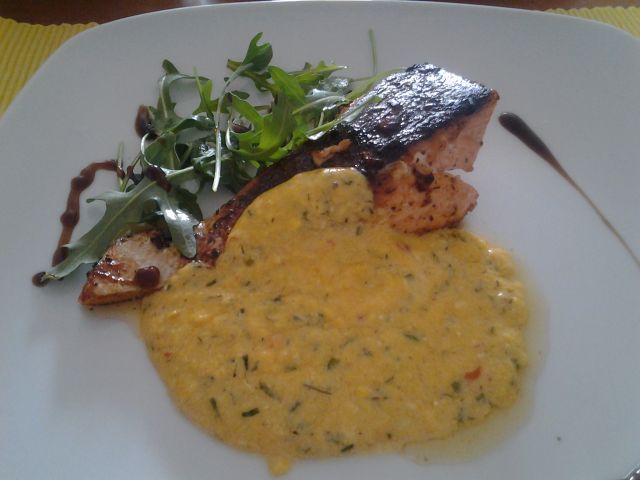 losos v zeliščni holandski omaki, musaka, čokoladna rolada z jagodami