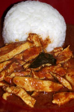 Danes: Panang piščanec z basmati rižem (zmanjkalo zgoraj omenjenega sticky riža) in za pogasiti pekočnost(kremasto krustljava solata iz koromača, jabolka, avokada, rdeče čebule, nesekljanega svežega koriandra, okisano z limetinim in pomarančnim sokom, soljeno in popoprano.