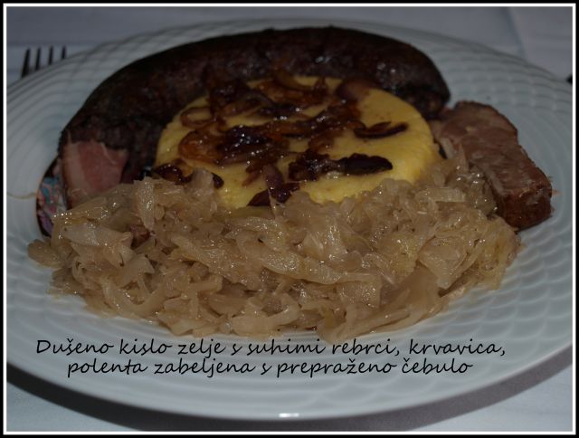 Dušeno kislo zelje s suhimi rebri, polenta zabeljena s prepraženo čebulo, krvavica.