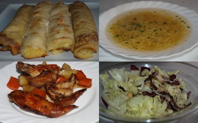 Goveja juhica; pečene perutničke s krompirjem (pečeno v vrečki), endivija, radič, čičerika, naribana zelena in črna redkev; zapečen palačinke nadevane s skuto in kokosom: