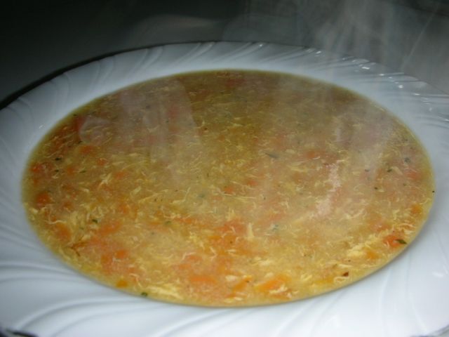 Otroška zdrobova juha, ostanek krompirjeve tortice od včeraj, pogreto v mikrovalovki, solata iz kuhane cvetače in korenja, skutino pecivo.