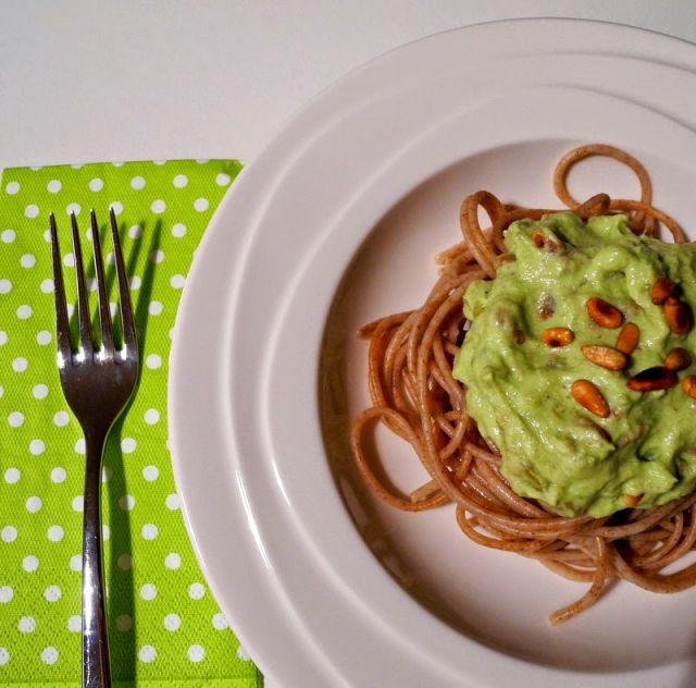 Lahko sobotno kosilo: špageti z avokadom, pinjolami in puranom.