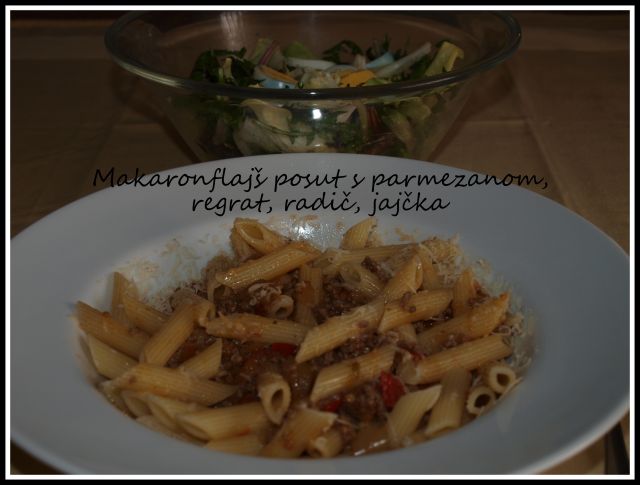 Tudi pri nas za fanta makaronflajš, mešana solata ( zeljna, regrat, zelena, radič, jajčka)