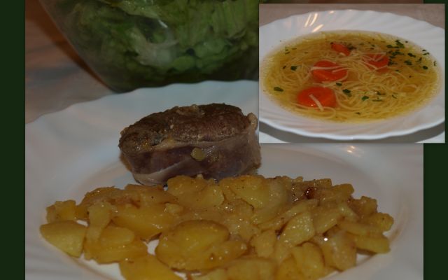 Pozno popoldansko kosilo: goveja juhica, pražen krompir, govedina iz juhe (doma ni bilo hrena, zato je brez zosa), zelena solata: