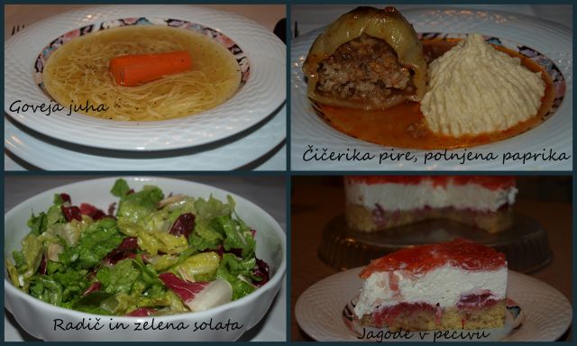 juha s testeninami, pečen zajček, pire krompir, zelena solata, duša in telo pa sta dobila dozo sladkega
