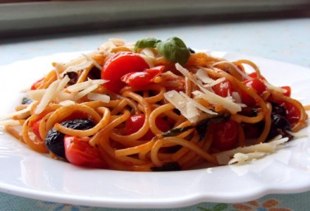 Včeraj: špageti z zelenjavno omako in paradižnikovo-kumarična solata.
