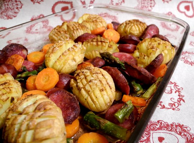Včeraj: klobase z zelenjavo iz pečice, začinjene z indijskimi začimbami: