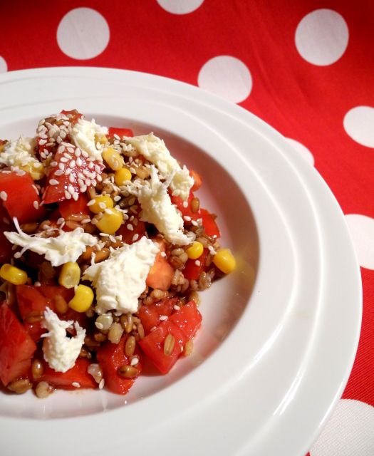 Pa sem zato imela zelenjavno solato s sirom, konopljinimi, lanenimi, bučnimi, sezamovi semeni, orehi, pinjolami, češnjevcem, kar pa zadnje čase obožujem....