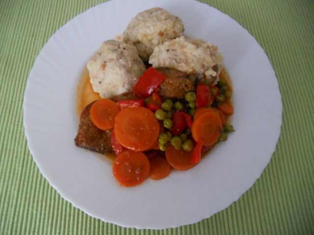 Telečji in piščančji koščki v omaki, dušen riž s porom, korenčkom, bučko , zelena solata salanova, rdeč hrastov list, rukola in radič
