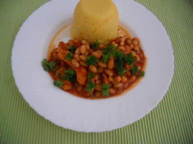 Danes: piščanec s fižolom, polenta, mešana solata (paradižniki, kumara, paprika, mozzarella)