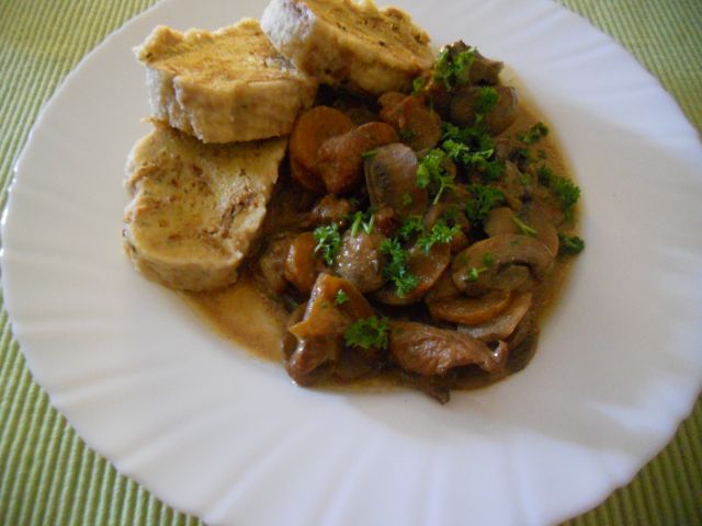 Danes: piščančji file s šampinjoni in korenčkom, kruhovi cmoki, mešana solata (paradižniki, kumara, paprika, mozzarella)