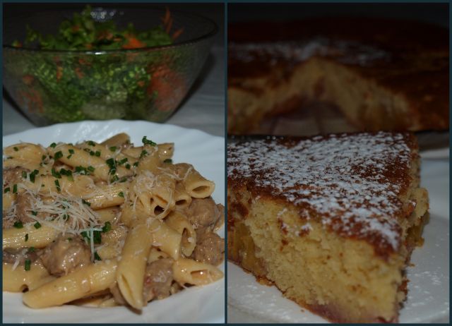 Makaroni z mesom in šampinjoni, zelena solata s korenčkom, ...ponovno breskova pogača (na željo mladinca)
