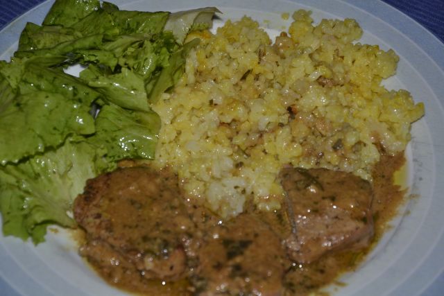 Ninja24Danes: svinjska ribica v omaki z žajbljem in rožmarinom, prepečen riž z malo curryja, le za barvo