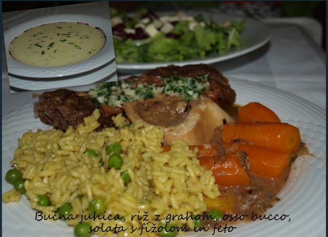 Juha, pečen piščanec, rižota z bučko, zelena solata.