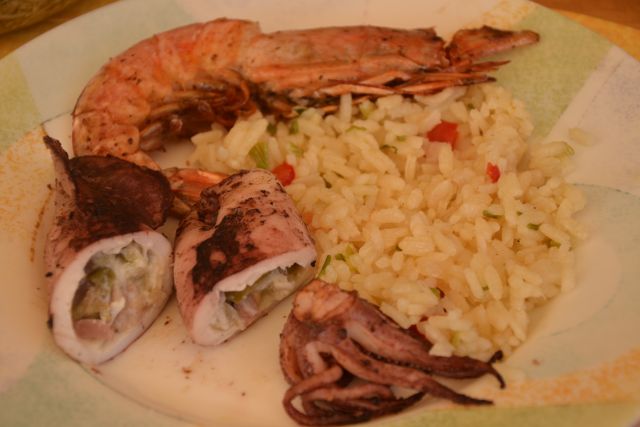 Pri nas še vedno pasje vroče: Solata iz kale (kodrolistnega ohrovta), brstičnega ohrovta, avokada, nalistanih mandeljev, malo parmezana in čez limonin vinaigrette. Piščančja prsa z žara po cajun začinjena. Nekoliko čudne mešanice izraelskega kuskusa, orza in kinve, skuhano na juhi. :)