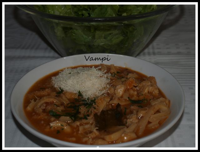 Pri nama danes malo drugače, kot sem napisala. Juhe ni bilo, ker se je skisala, namesto vratovine je bila sočna svinjska pečenka, zraven pa spet ajdova kaša z jurčki (včeraj nabranimi, pa ne z moje strani) in solata (zelena solata, radič, rukola, drobnjak in peteršilj, vse z vrta).