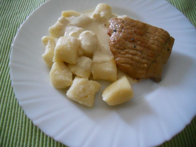 danes pa puranji zrezki v smetanovi omaki, široki rezanci, zelena solata z rukolo,