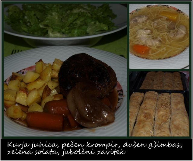 Juha, vratovina v omaki, pire krompir, bučka z origanom, solata.