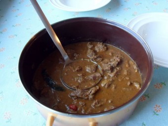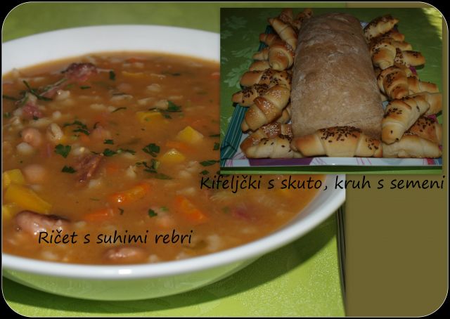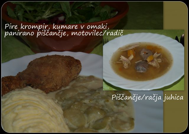 Zdrobova juha s porom in koenčkom, preostenek francoske solate, krompirjeva solata, kranjska klobasa, mesni polpet, za najmlajšega pa svedrčki s paradižňikovo omako.