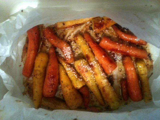 mojezlato http://kosilazavsakdan.blogspot.com/Korenje iz pečice, pire iz krompirja in hokaido buče ter zrezki v omaki, domača paradižnikova solata