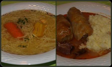 Danes goveja juha z zdrobovimi cmoki, špinača, pire krompir, zelena solata