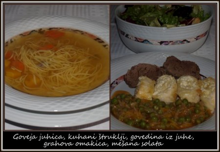 Včeraj smo jedli juho, domačo pico in solato. Danes pa bo zeljni zvitek in kuhan krompir. Pa juha in solata.