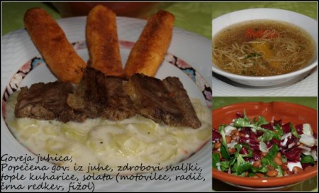 Goveja juha z zdrobovimi cmoki, ocvrte perutničke, meso po dunajsko, pražen krompir, regrat, motovilec in zeljna solata