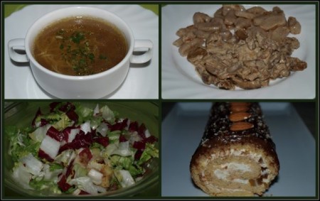 Goveja juhica (od včeraj); ščipanci z ocvirki, teletina s šampinjoni; mešana solata; rolada