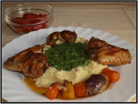Pire (krompir, zelena), špinača, v vrečki pečene perutničke, kisla paprika