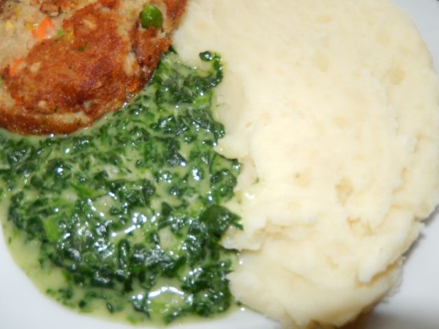 | Danes, špinača, pire krompir, žitni polpeti, solata in