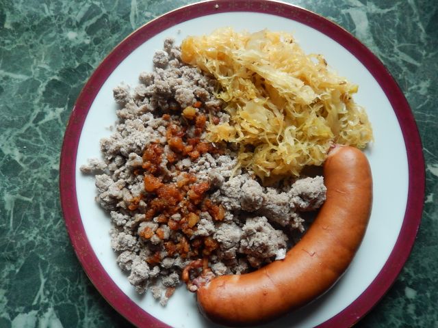 Vsesladkosneda (slastnakuhinja.blogspot.si)Ajdovi žganci, praženo kislo zelje, klobasica in kofetek.