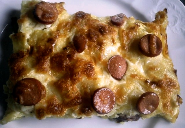 Goveja juha z zakuho, kraljevski krompir z muškatnim cvetom, s podloženimi koluti kranjske klobase in "nadloženo :)" hrenovko, gratiniran z mozzarello, žvrkljanim jajcem in malo kisle smetane, zraven skleda radiča vseh barv in regrata ...![]()
