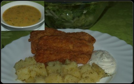 Zelenjavna juhica; kuhan krompir povaljan v maslu, paniran ribji file, zelena solata: