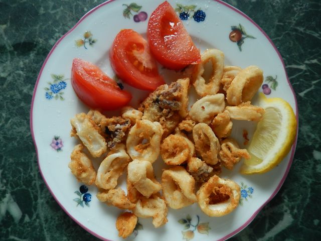 Danes: hokaido juha s čemažem, ocvrti kalamari in krompir v solati.