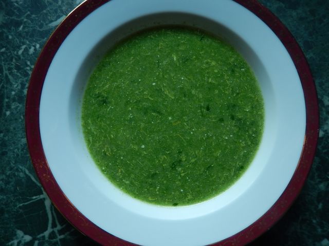 Juha iz koprive, zdroba, čemaža in jajčka, goveji zrezki, široki rezanci, mešana zelena solata - motovilec, regrat, radič.