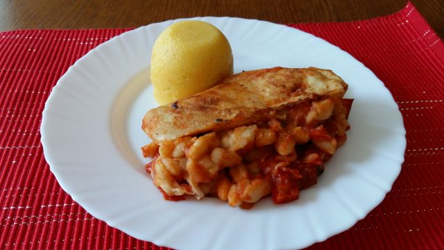 Danes: piščanec po špansko z belim foižolom, polenta, mešana solata