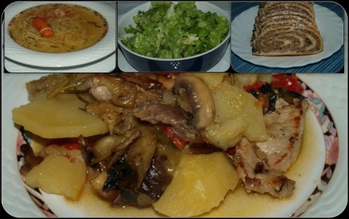 danes goveja juha, svinjska pečenka, pečen krompir, pražen ohrovt s porom, popečeni šampinjoni s česnom in peteršiljem, mešana solata