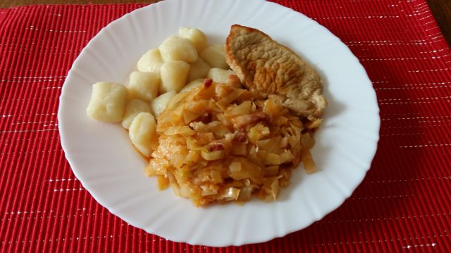 Danes: dušeno sladko zelje s slanino , njoki, svinjski zrezki