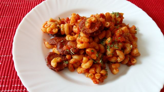 Danes: testenine s klobaso in paradižnikom, mešana solata, kokosovi gumbki z marmelado