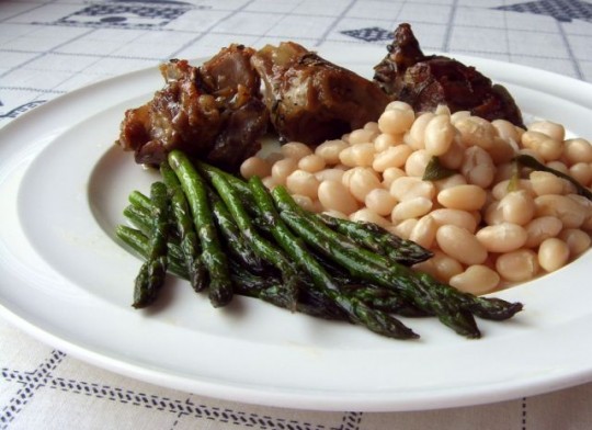 : pečeno jagnje, bel fižol z žajbljem, šparglji