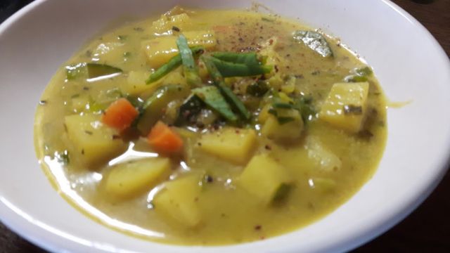 Včeraj krompirjeva juha z zelenjavo in kurkumo kot glavno začimbo.