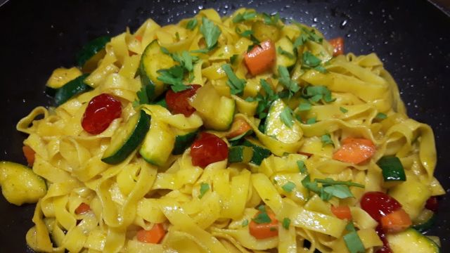 Danes pa fetuccine z zelenjavo in prav tako s kurkumo (testenine proabila od včeraj, so bile z mletim mesopm in zelenjavo).