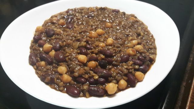 NENA58Danes - oranžna in zelena leča, čičerika, rjavi fižol, vse na čebuli, česnu in ingverju ter množici indijskih začimb, poleg soli in popra seveda: