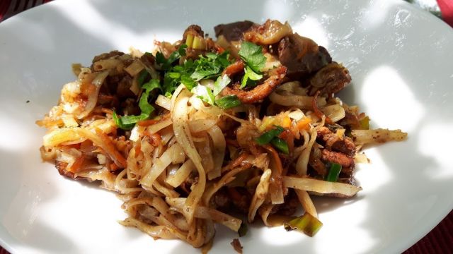 Nedleja. svinjina, narezana na tanke trakce, začinjena s sumakom, pražena, potem zelenjava, le na kratko prepražena, za dodatek nekaj širokih rezancev: