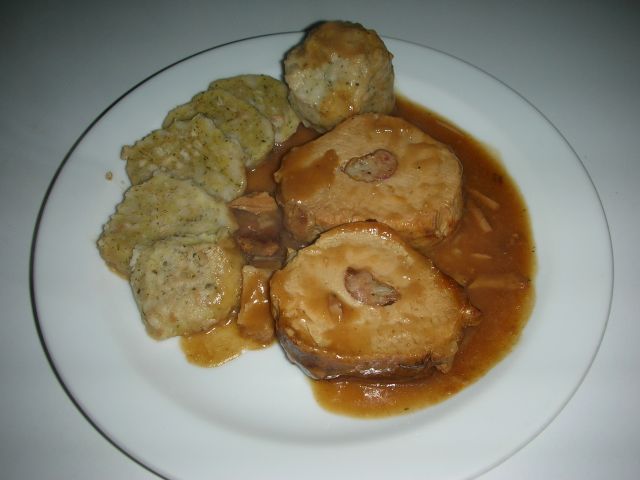 Danes: goveja juha z ribano kašo, svinjska ribica nadevana s klobaso, spasirana omaka od pečenke, kruhovi cmoki, zelena solata z redkvico, skutni štrudelj bo, ko se ohladi in razpokane domače češnje![]()