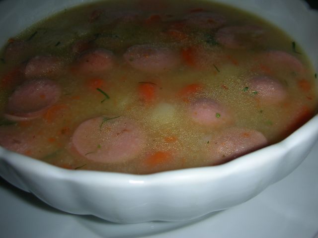Včeraj: Babičina krompirjeva juha s hrenovko, šmorn in kompot iz jabolk in rabarbare.
