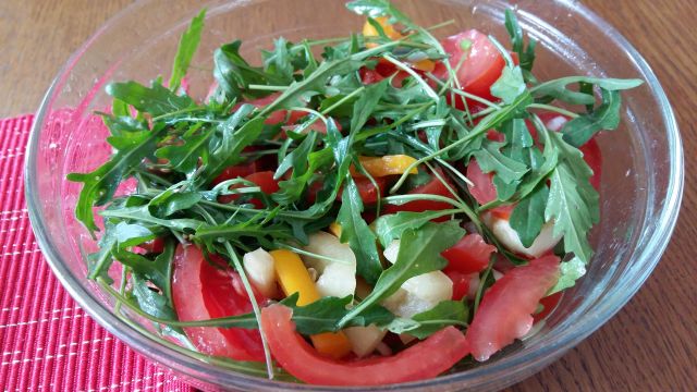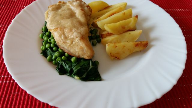 Danes: piščanec s parmezanom, blitvo, grahom in pečenim krompirjem, solata z rukolo in paradižnikom