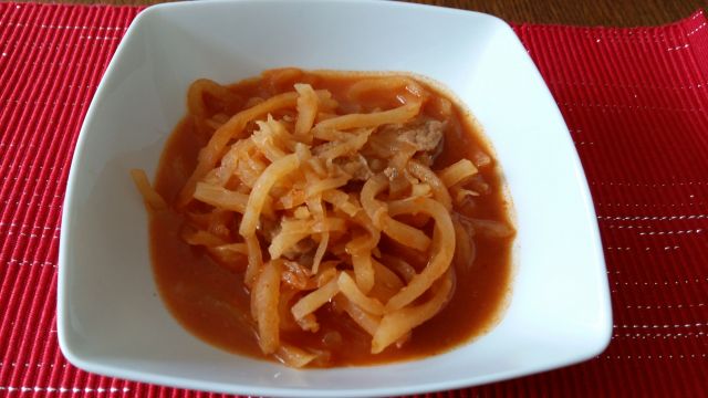 danes vratovina v čebulni omaki, domači krompirjevi svaljki na maslu in žajblju, ledenka, zelje in redkvice v solati