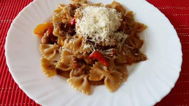 Danes: polnozrnati metuljčki z lečo in rdečo papriko, mešana solata