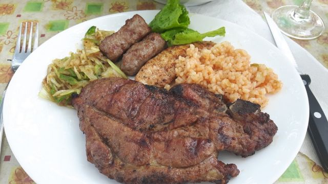 | roštilj: kotlei i varivina, piščančji file, Ave čevapi; priloga đuveč, pa tanko zrezana čebula, parpika, začinjeno, in na to položeno pečeno meso, da semalo soka navzame; zelena solata in kozarec rdečega zame (no, trije kzarci), špricer zanj in sina, pis pepsika ...